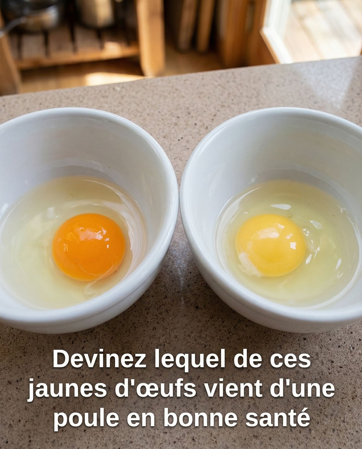 Aux États-Unis, tous les oeufs qui sont vendus sont de couleur jaune. Qu’ils soient bio ou pas chers; ils sont tous jaunes et la texture interne n’est pas aussi épaisse. Quelle en est la raison? Serait-ce parce que tous ces œufs proviennent de poules de mauvaise qualité? Avez-vous d’ailleurs jamais vu un œuf orange? Il m’a fallu 30 ans pour voir l’œuf d’une poule saine.
