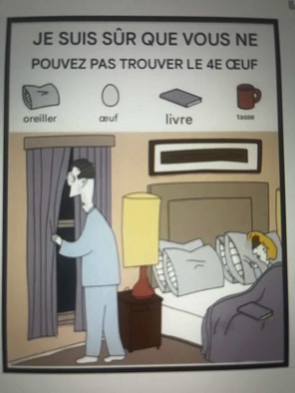 À première vue, la scène de la chambre semble tout à fait ordinaire : un lit, une lampe et des étagères. Mais quatre objets du quotidien, un livre , un œuf , une tasse et un oreiller , sont astucieusement dissimulés dans l’image. Le défi ? Vous n’avez que 17 secondes pour tous les trouver. Cela peut paraître simple, mais cette énigme est plus complexe qu’il n’y paraît.