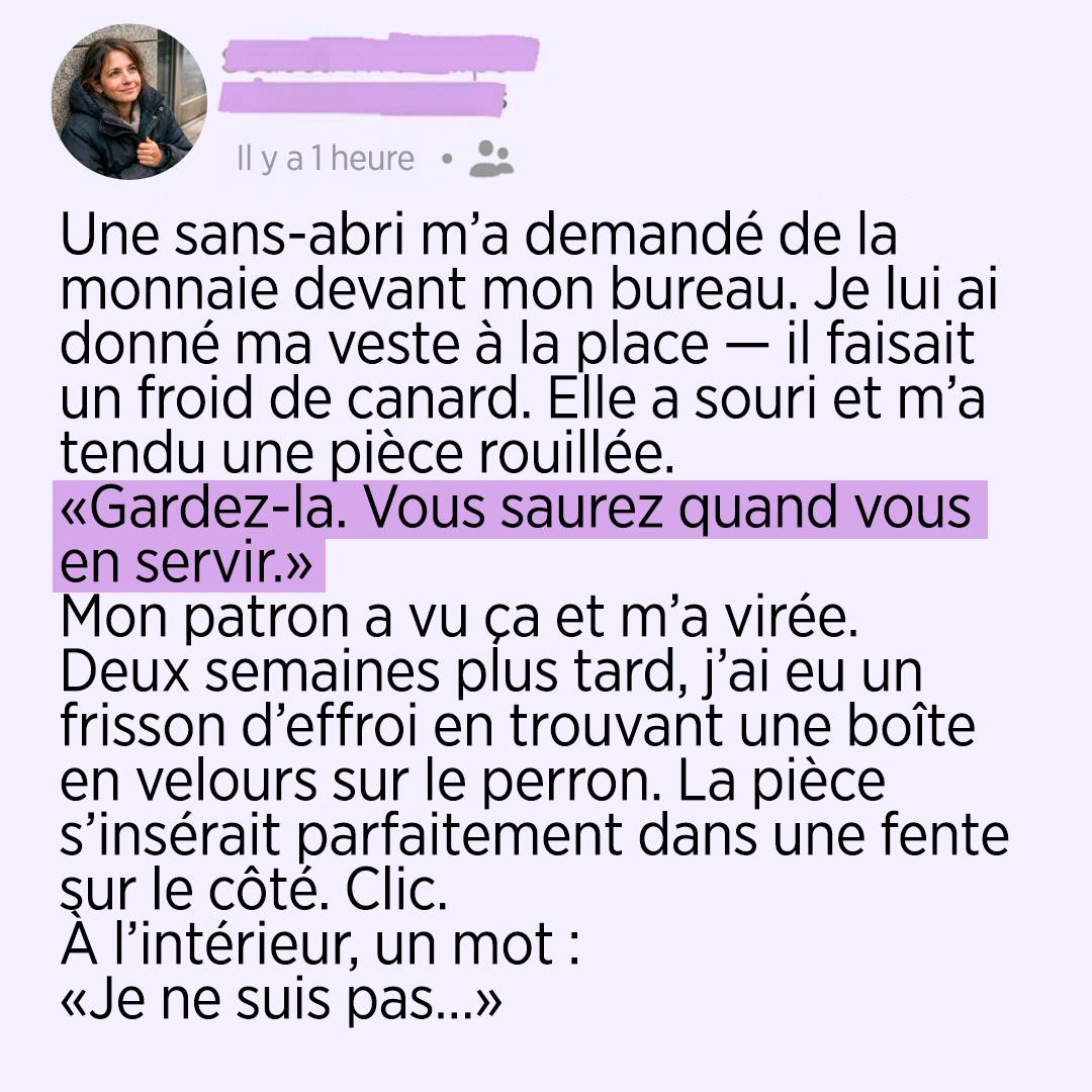 Quand elle m’a demandé doucement si j’avais un peu de monnaie, j’ai d’abord répondu comme tout le monde : « Désolée. » Puis j’ai remarqué ses mains qui tremblaient, son pull trop fin, l’absence de manteau. Et surtout, son regard. Pas suppliant. Juste lucide.