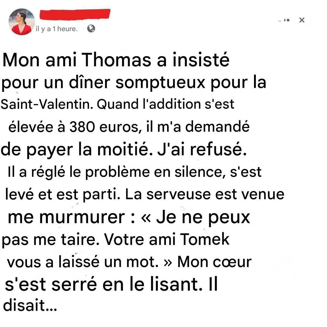 « On partage ?» Partager l'addition n'a rien d'inhabituel en soi. Beaucoup de couples le font. Mais dans ce cas précis, le contexte change tout. C'était son idée. Sa surprise. Sa « soirée spéciale ».