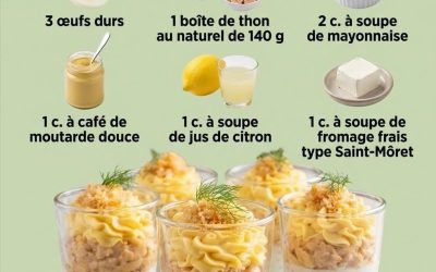 Verrines de thon aux œufs mimosa et mayonnaise Une entrée fraîche, simple et élégante, idéale pour un apéritif ou un…